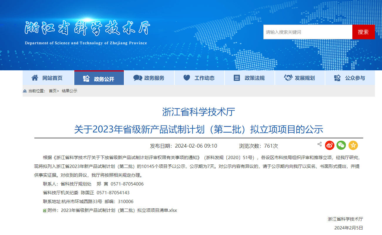 浙江省科学技术厅关于2023年省级新产品试制计划(第二批)拟立项项目的公示